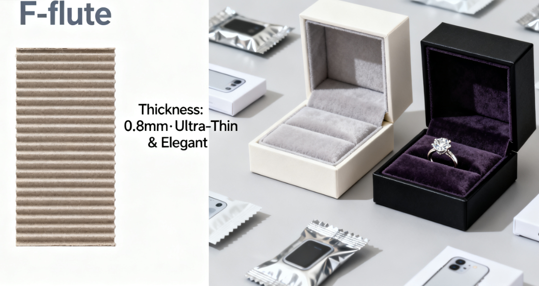 Ciri-ciri: Papan bergelombang paling nipis dan padat. Walaupun prestasi penampannya lebih lemah, ia memberikan perlindungan yang baik untuk barang kecil yang rapuh. Oleh itu, papan bergelombang jenis F kerap digunakan untuk pembungkusan dalaman barang runcit kecil seperti kotak minyak wangi dan kotak barang kemas, yang menekankan rasa minimalis dan berkualiti tinggi.
