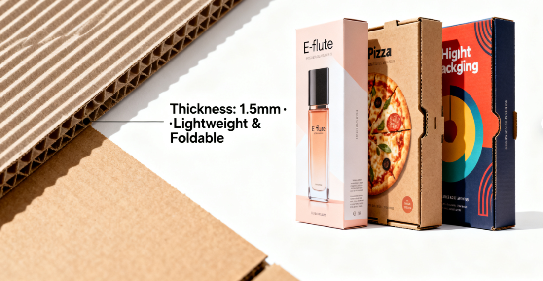 Ciri-ciri: Ringan dan nipis dengan ketumpatan alur yang tinggi, sesuai untuk melindungi barang kecil. Papan bergelombang jenis E mudah dilipat, disimpan, dan diangkut dengan mengambil ruang yang sedikit, maka digunakan secara meluas dalam pembungkusan produk.