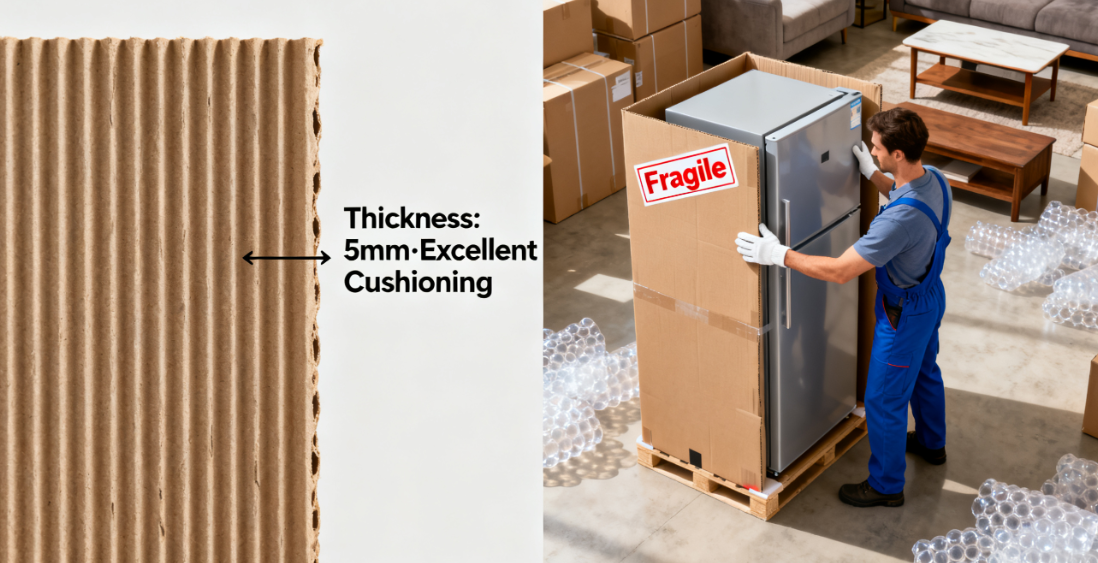.Untuk barang yang berat atau mudah pecah, A-Flute (5mm) biasanya merupakan pilihan terbaik. Ia memberikan tahap peredaman dan penyerapan hentakan yang paling tinggi disebabkan oleh struktur tebalnya, menjadikannya ideal untuk melindungi peralatan rumah, perabot, dan barang presisi lain semasa pengangkutan jarak jauh.