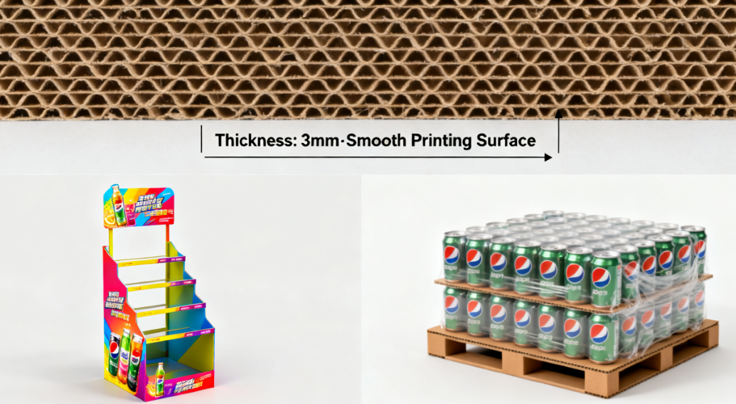 Kami mencadangkan B-Flute (3mm). Ia menawarkan kekuatan mampatan yang sangat baik untuk penindanan dan rintangan cucuk yang baik, manakala permukaannya yang licin sangat sesuai untuk pencetakan berkualiti tinggi, menjadikannya pilihan utama untuk rak paparan die-cut dan pembungkusan siap runcit.