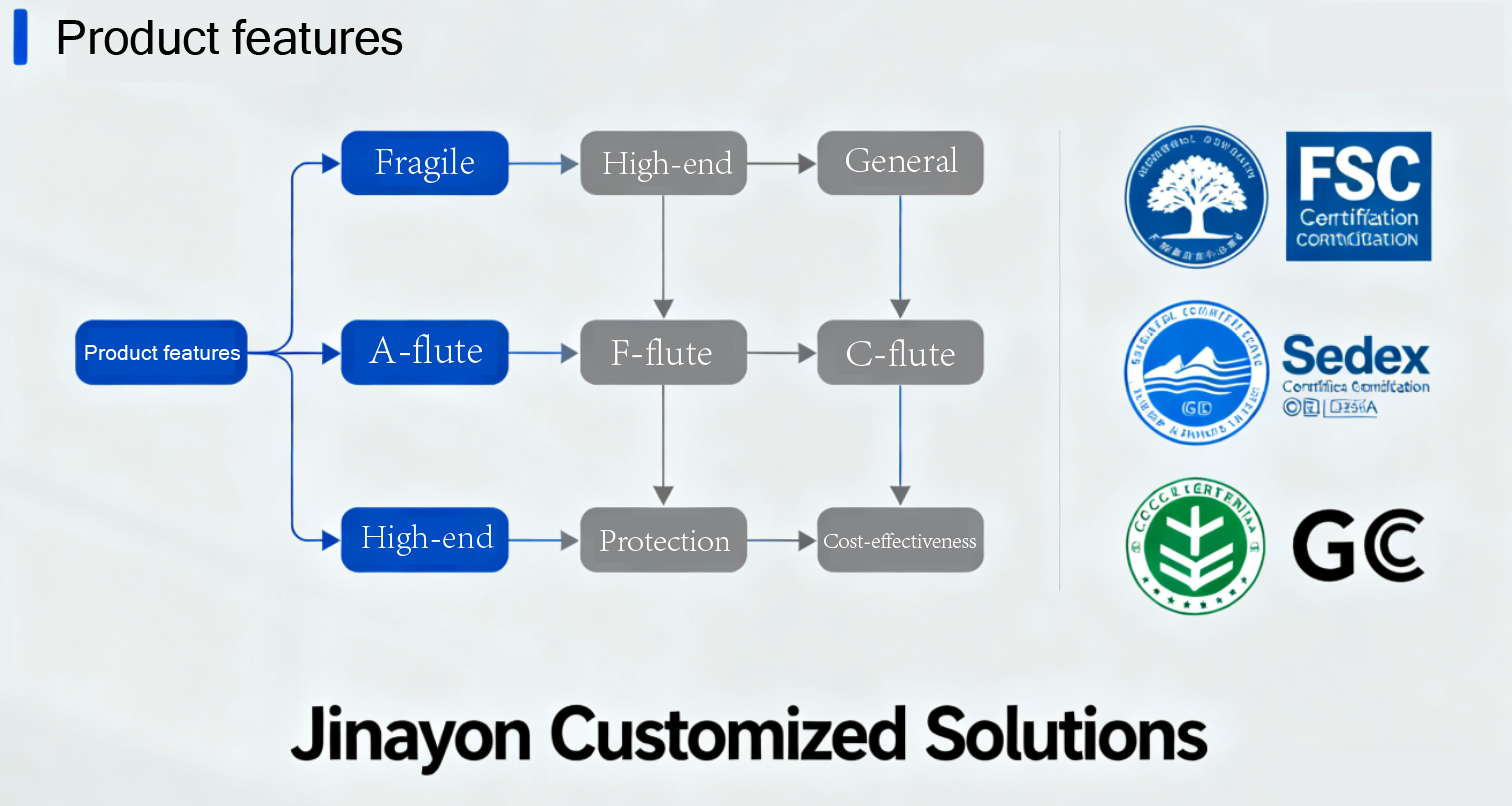Jinayon membantu pelanggan global membuat keputusan ini setiap hari, menyediakan penyelesaian papan bergelombang tersuai yang komprehensif daripada kotak eksport yang kukuh hingga pengalaman membuka bungkusan yang anggun. Dengan pelbagai pensijilan antarabangsa termasuk FSC, Sedex, dan GCC, Jinayon memastikan pengepakan anda tidak sahaja kuat tetapi juga mematuhi peraturan, mesra alam, dan boleh dipercayai.