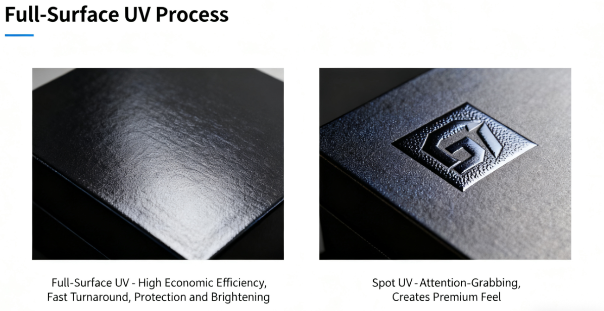 UV-printen wordt veel gebruikt in de verpakkingsindustrie vanwege zijn voordelen. De twee belangrijkste oppervlaktebehandelmethoden — full-surface UV en spot-UV — voldoen effectief aan de behoeften van de meeste mensen. Full-surface UV is kosteneffectief en sneller te produceren, en biedt bescherming en verhelderende effecten; spot-UV trekt effectief de aandacht van klanten en zorgt voor een premium gevoel van het product. Consumenten kunnen daarom verschillende processen kiezen op basis van hun behoeften om het beste producteffect te bereiken.