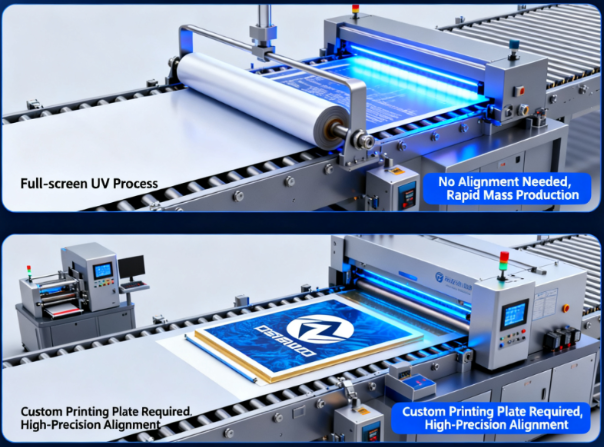 Volledige UV-coating is over het algemeen voordeliger, omdat er geen aangepaste platen nodig zijn en de productiesnelheid hoger is.