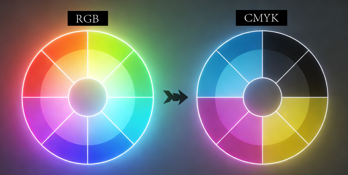 As telas usam cores RGB enquanto a impressão utiliza cores CMYK. A conversão direta de arquivos RGB para CMYK frequentemente resulta em cores mais escuras e menos vibrantes porque os sistemas de cor possuem gamas diferentes.